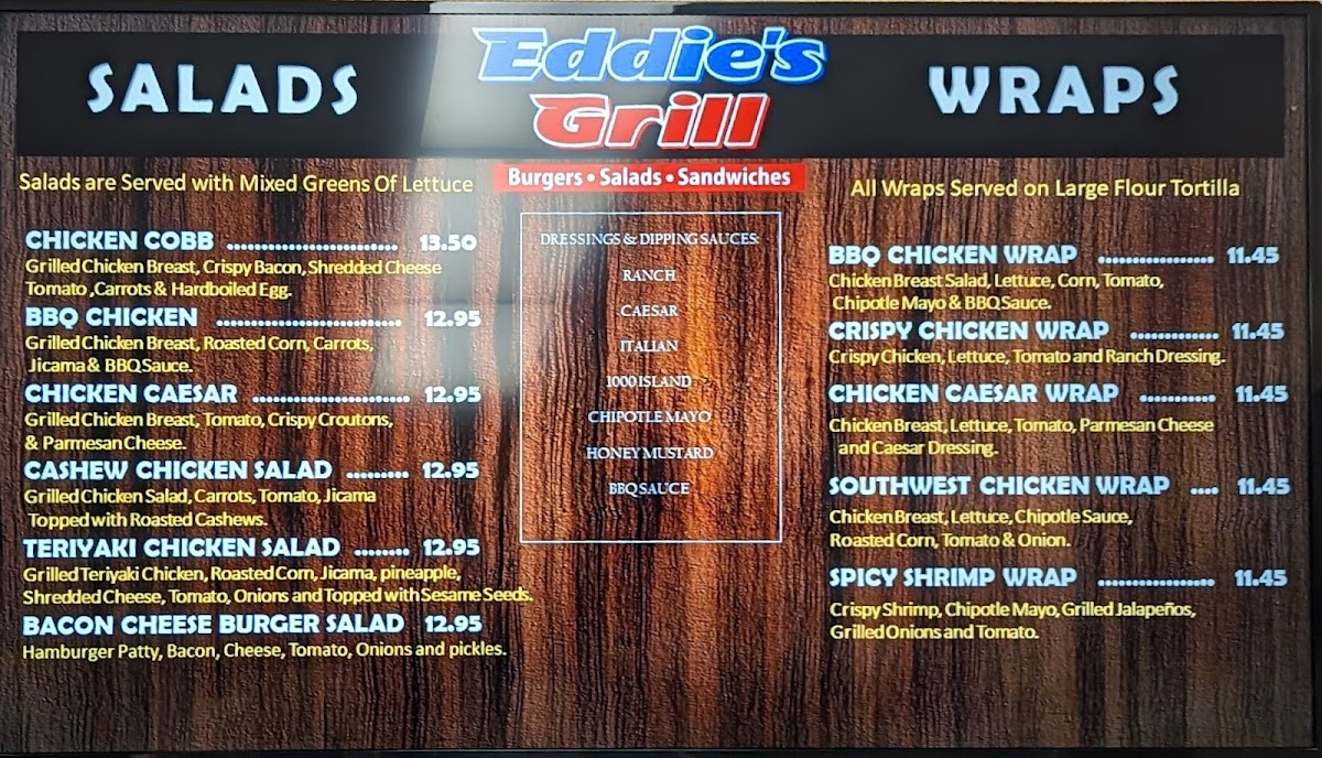 Pair your meal with a rich chocolate shake, made with Thrifty ice cream, for a sweet finish. With friendly staff and quick service, Eddie's Grill Village is not just a meal, but an experience that keeps customers returning for more.